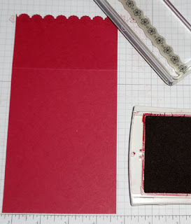 Start with a piece of card stock 4-1/8 x 8 inches, scored at 5-1/2 inches. Use the Egdelit die to cut a decorative edge along the short side. You should still have 5-1/2 inches to the fold mark. (Be sure to measure your gift card FIRST, adjust your dimensions accordingly if your gift card is too big, or too small. I made my card holder slightly wider than the gift card I was using.)